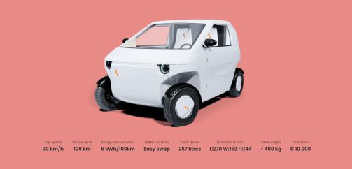 The dimensions of Luvly O are 2.7 x 1.53 x 1.44 meters. The electric car weighs only 380 kg, about five times less than the Tesla Model 3. Due to the light weight, the energy consumption is only 60 Wh/km, which is about two to four times less than that of “full-size” electric cars.