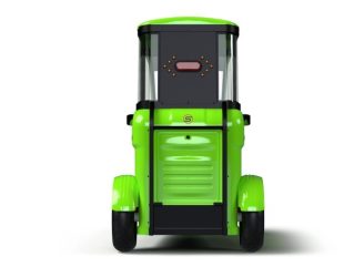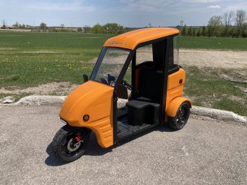 Despite the fairly high speed, the weight distribution of the low-mounted battery and motor provides stability during cornering. The motorcycle-style steering provides easy maneuverability even in tight spaces. For added safety and convenience, the three-wheeler can be optionally equipped with a rearview camera and stereo system.