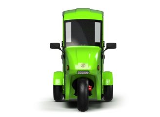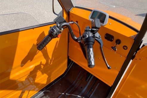 The compact three-wheeler is really tiny. It is only 91 centimeters wide, 229 centimeters long and 168 high. But it can comfortably transport not one, but two people. The passenger will ride behind the driver, like a two-passenger motorcycle, as the seat back slides backwards. Design elements from the bike world continue in the controls on the handlebars, twist throttle and manually operated disc brakes on all three wheels. This means there are no pedals in sight. The handlebars also feature a three-speed shifter and a forward/reverse switch.