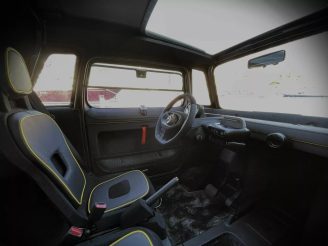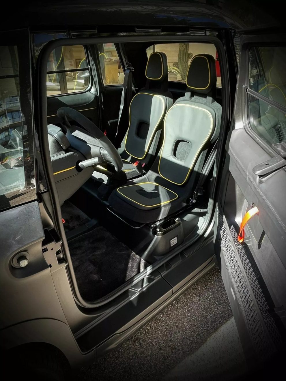 The interior of the Citroen Ami has been extensively updated to achieve a luxurious feel. The cheap plastic surfaces of the dashboard, door cards, seats and roofliner have been covered with black Alcantara and leather with yellow piping.