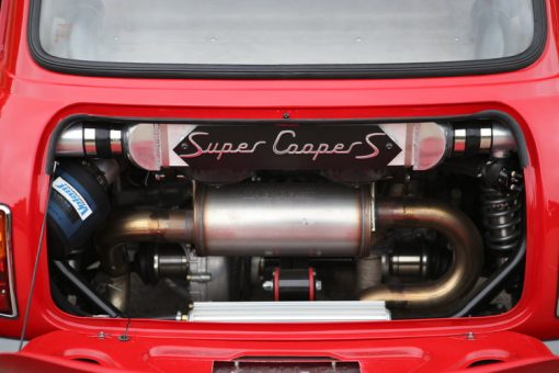 While packing a V6 into a small front-wheel drive car like the Mini was a challenge, Gildred Racing did an excellent job. The engine compartment now houses the fuel tank and radiator, and a huge exhaust can be seen when opening the trunk.