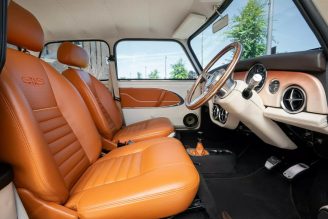 Inside, the Mini features new brown leather seats, a wooden-rimmed three-spoke steering wheel, and a Pioneer infotainment system with Apple CarPlay and Android Auto. There are also bespoke aluminum switches and buttons throughout the cabin.