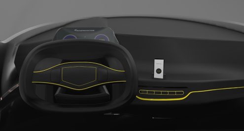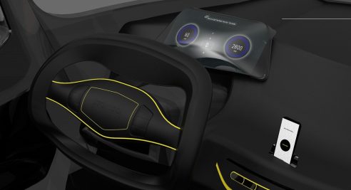 The Karcher Campus car has a cool interior with yellow highlights on the steering wheel, dashboard buttons, and built-in door speakers. It also has a smartphone holder and charger, an electronic display, and an app to track usage and pay for rides.