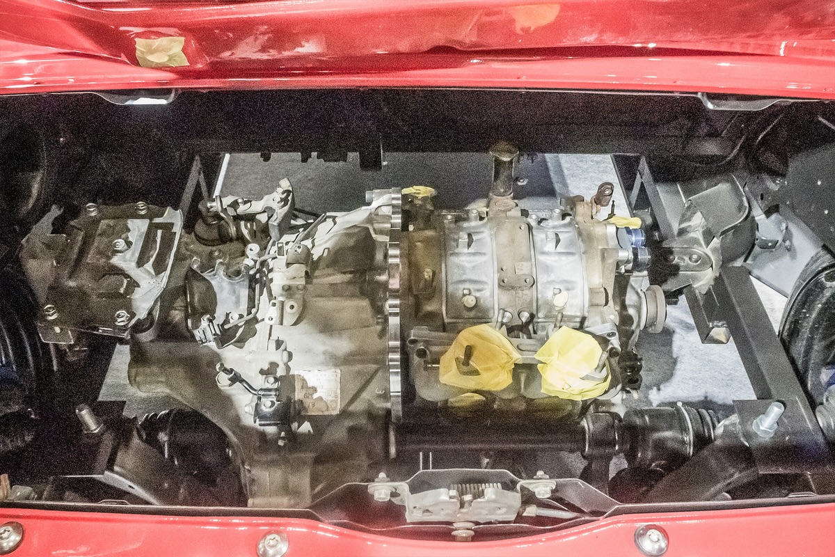 The heart of the build is the engine swap that turns this AZ-1 from novelty into lunacy. The original 660 cc Suzuki-sourced three-cylinder has been removed and replaced with a 1.3-liter 13B rotary. RE Amemiya didn’t stop there, opting to mount the engine transversely, an extremely rare configuration for this powerplant.