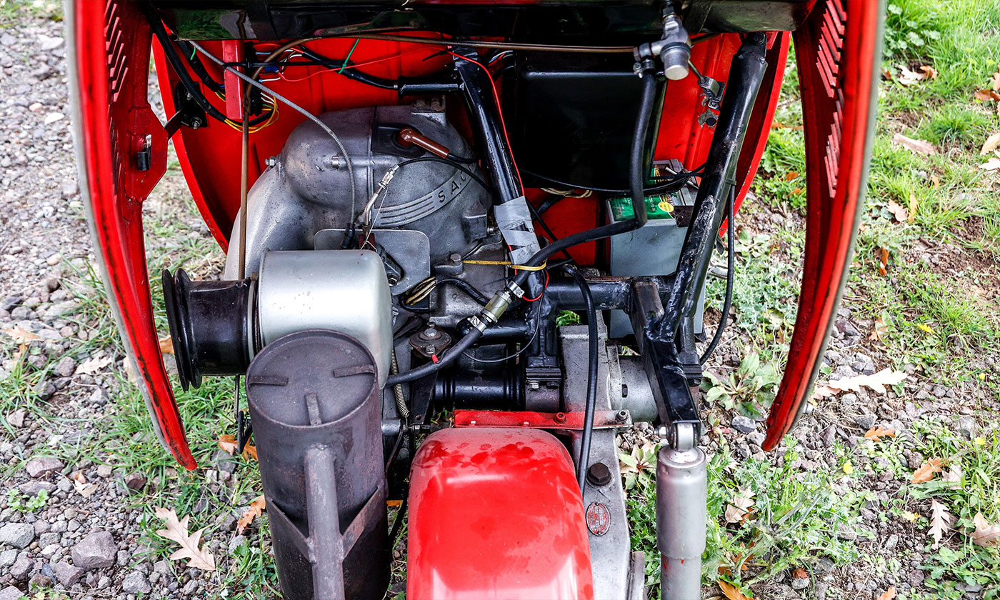 Power came from a 191cc Fichtel & Sachs air-cooled single-cylinder two-stroke engine mounted ahead of the rear wheel. With two sets of contact points, the engine could be reversed simply by shutting it off and restarting it in the opposite direction.