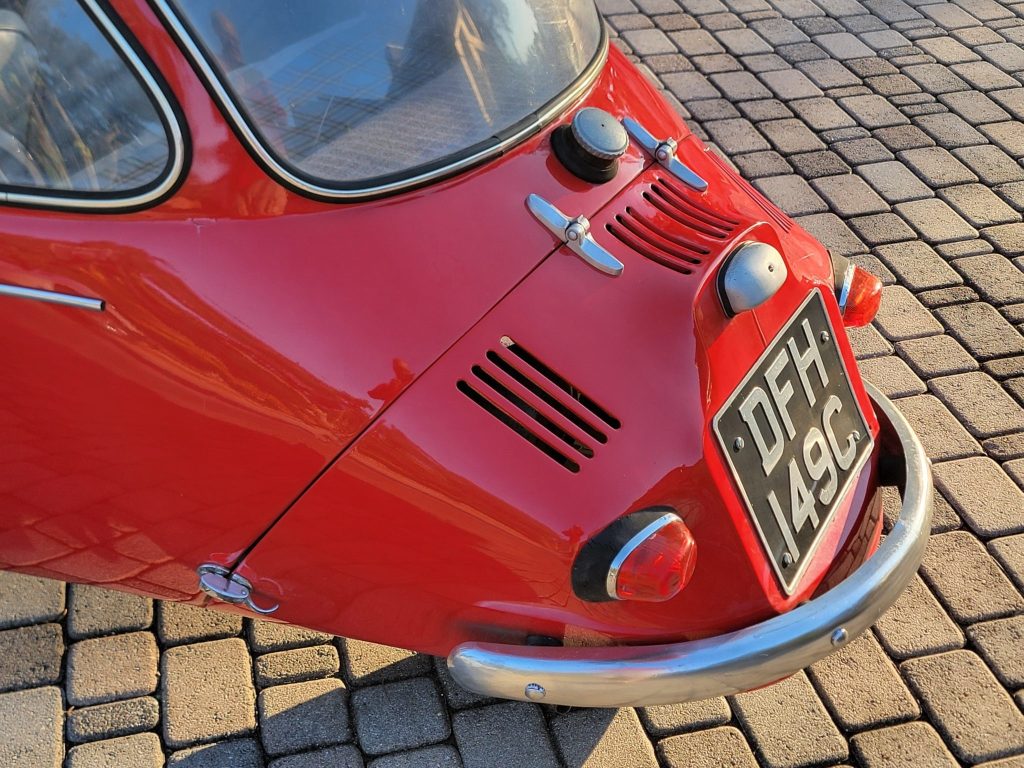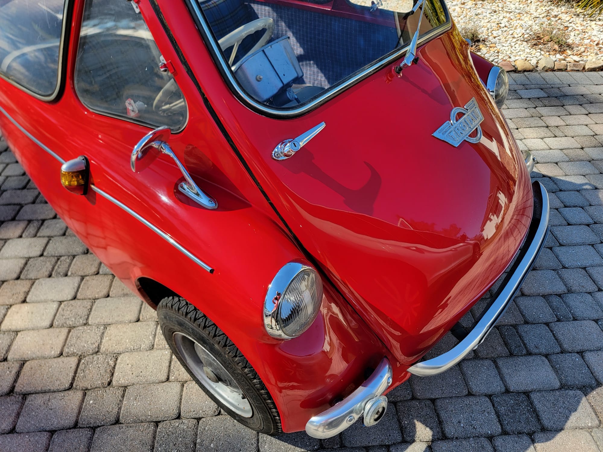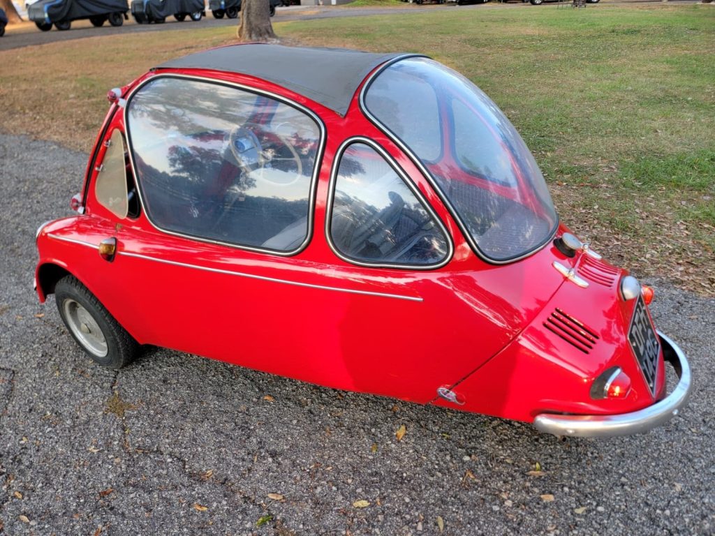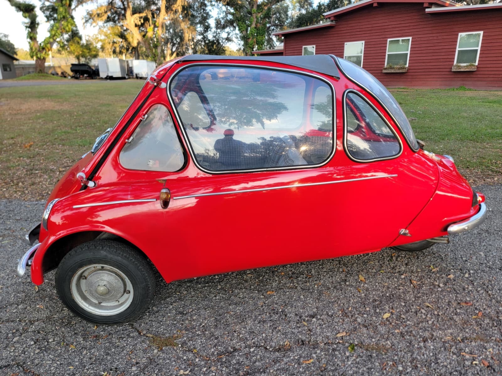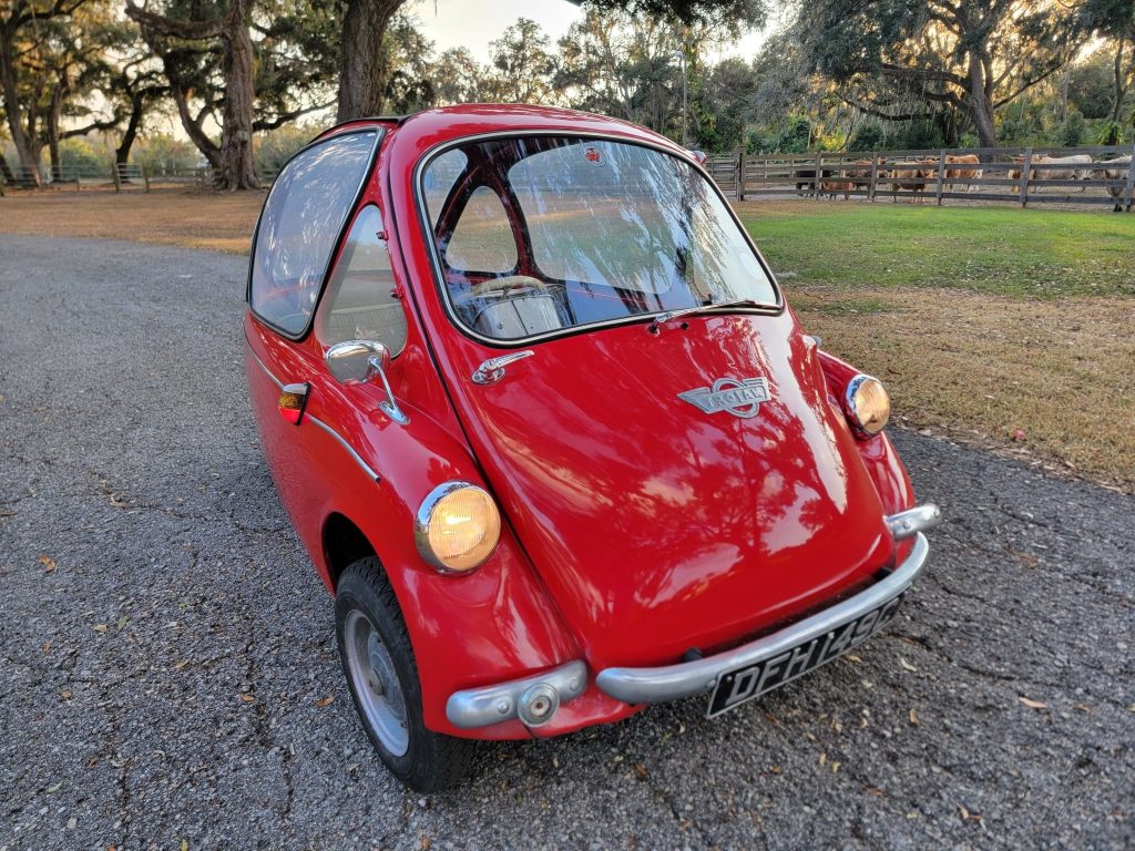 Features include a side-hinged front access door, canvas sunroof, eight curved greenhouse windows, chrome full-width bumpers, 10″ steel wheels, and hydraulic front drum brakes. Acquired by the selling dealer in 2024, it is offered with a clean Florida title identifying the vehicle as a Heinkel motorcycle.