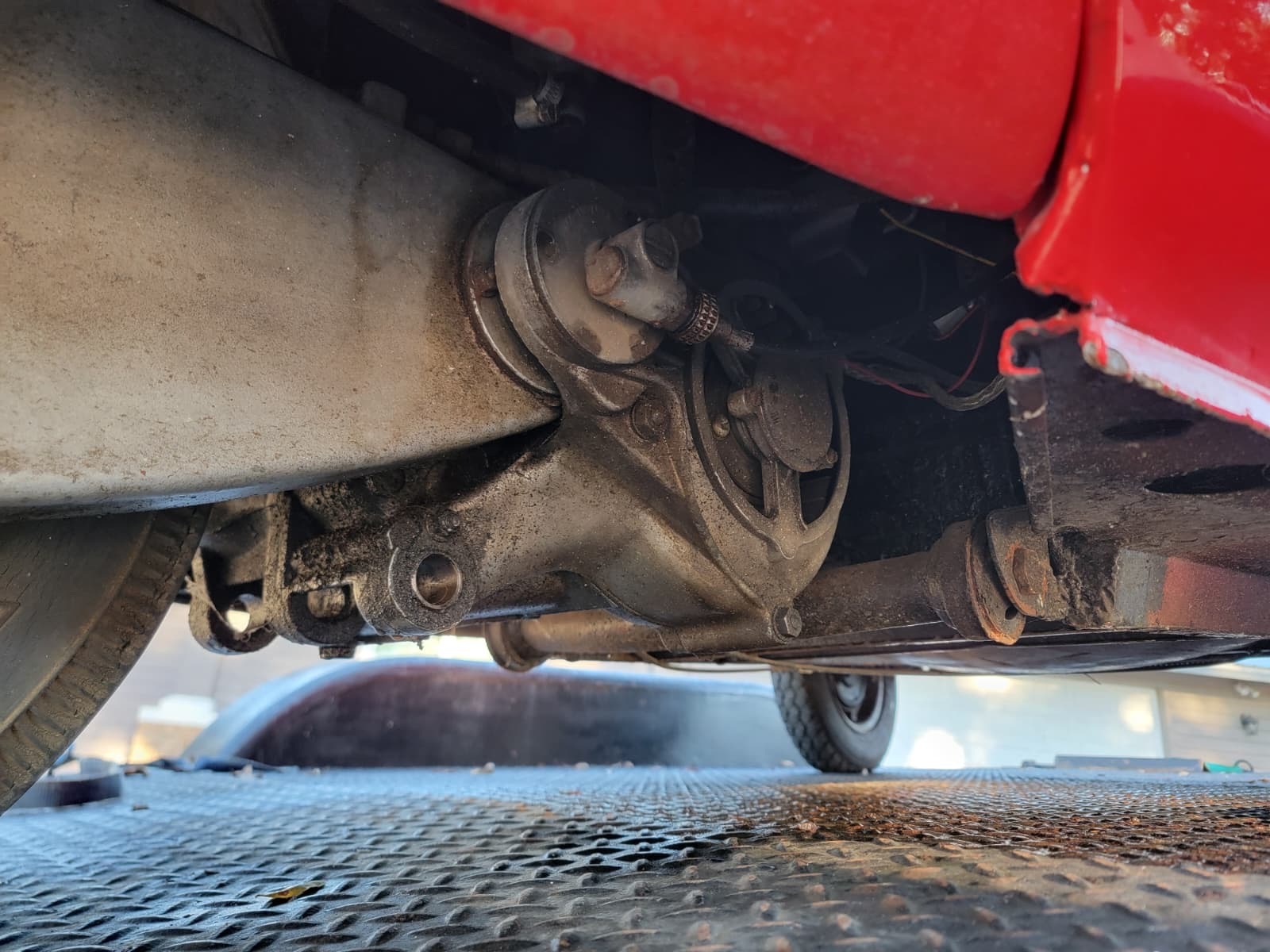 The rear body panel hinges upward to reveal the exhaust and rear wheel, which receives power through a multi-plate wet clutch, four-speed manual transmission, and an enclosed drive chain. Visible rust is noted on the exhaust and rear wheel nut, and while the reverse gear works, the selling dealer reports that it can be difficult to engage.
