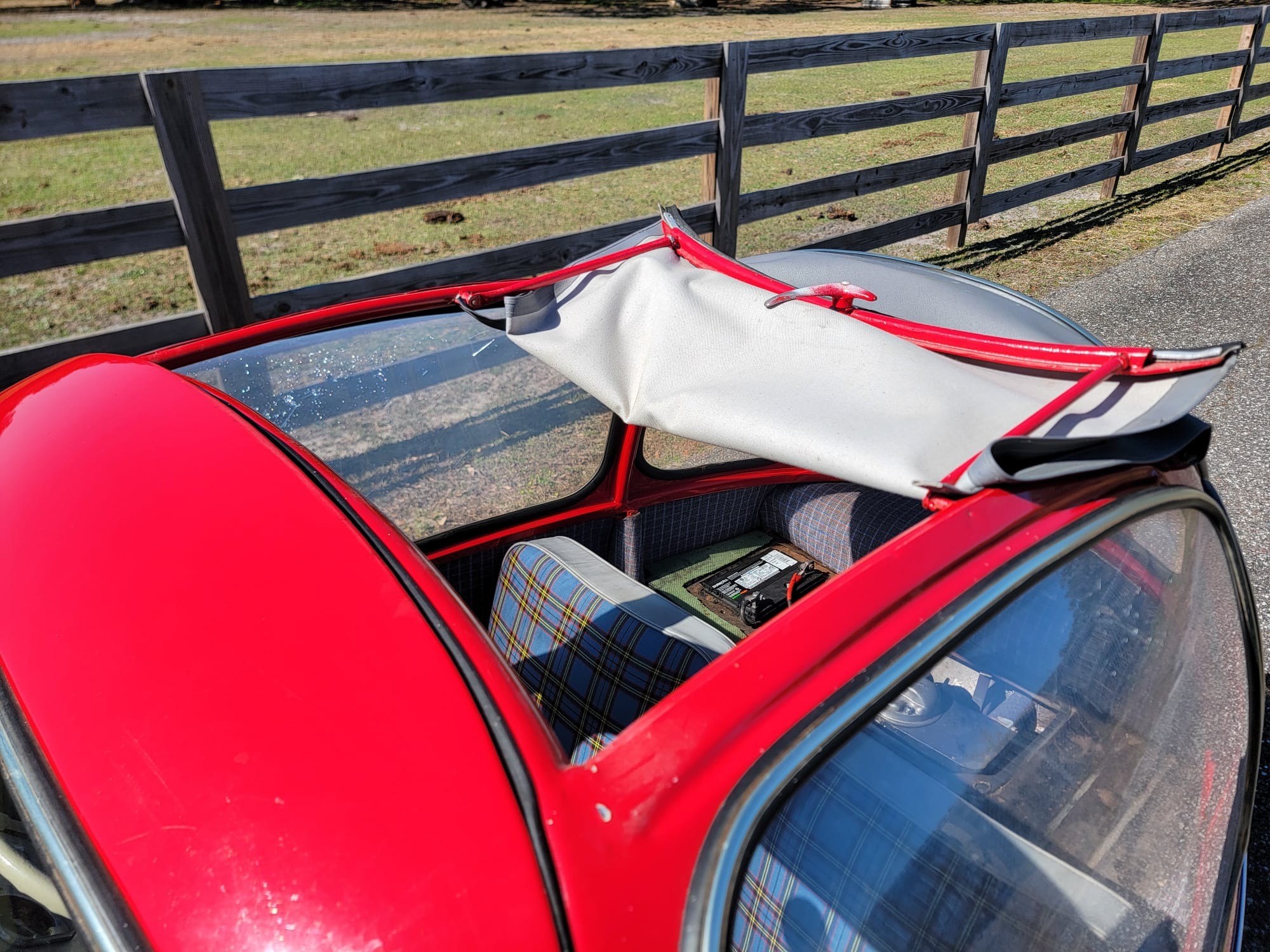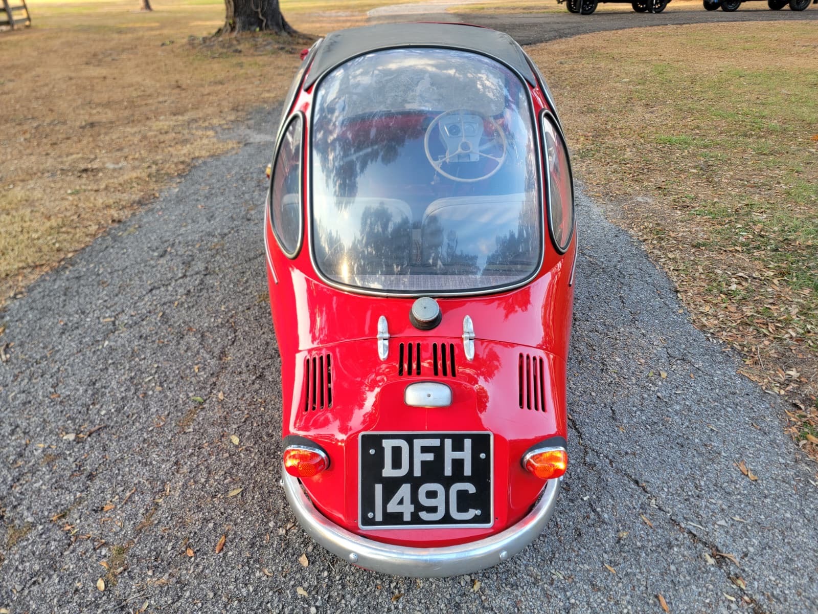This 1965 Trojan 200 is a three-wheeled, right-hand-drive example imported to the US from the UK, where it reportedly spent around two decades on display at Lincolnshire’s Bubblecar Museum beginning in the early 2000s. Finished in red with chrome trim and a blue tartan cloth interior, it is powered by an air-cooled 198cc four-stroke single paired with a four-speed manual gearbox.