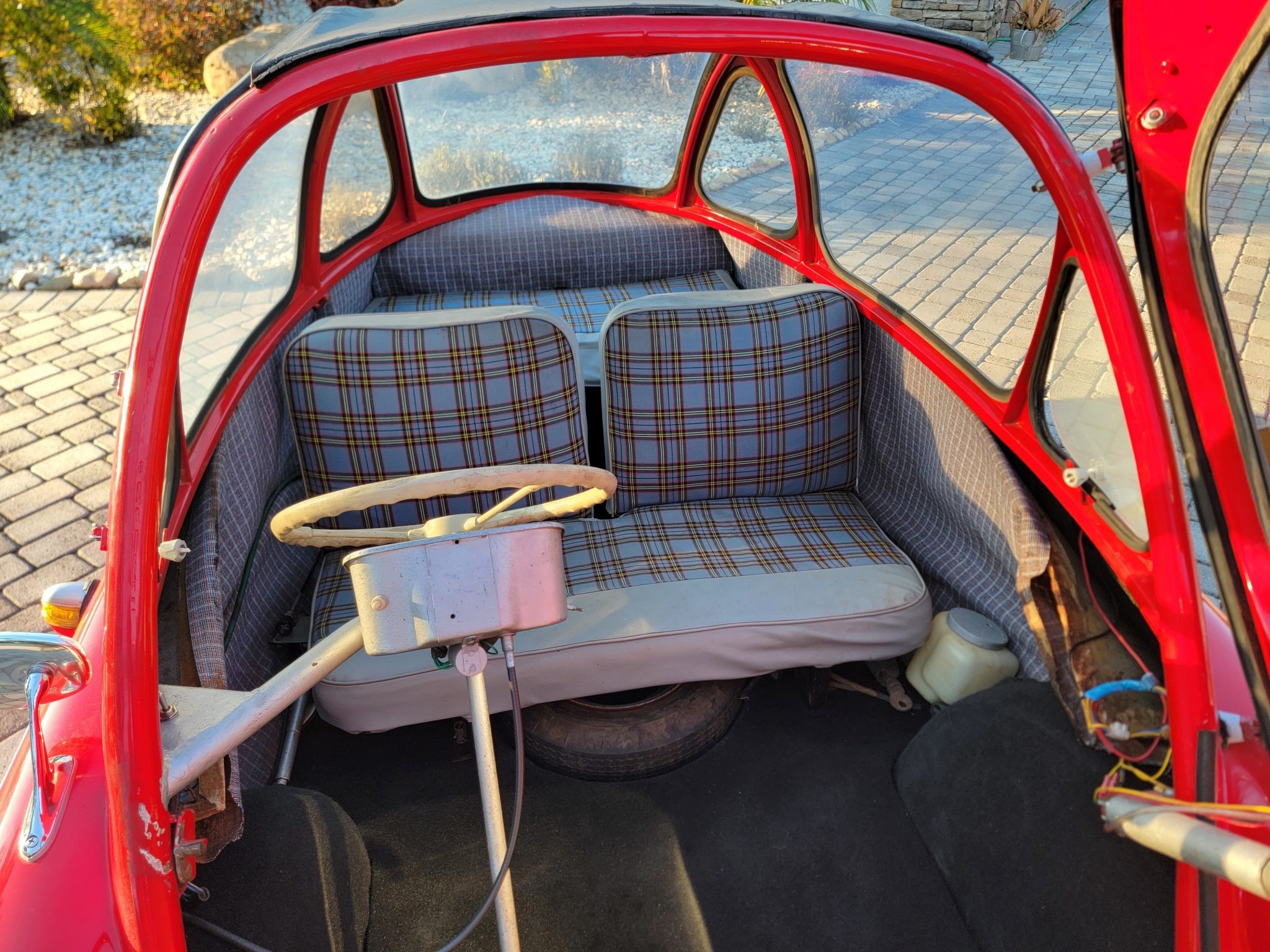 Its three 10″ silver steel wheels wear Michelin front tyres and a Trelleborg rear, with a spare stored beneath the seat. Independent front suspension uses leading swingarms with coils and shocks, while the rear employs a single-sided swingarm with a coilover. Braking is via hydraulic drums up front and a hand-operated mechanical drum at the rear. The selling dealer advises that the braking system should be serviced before the car is driven.