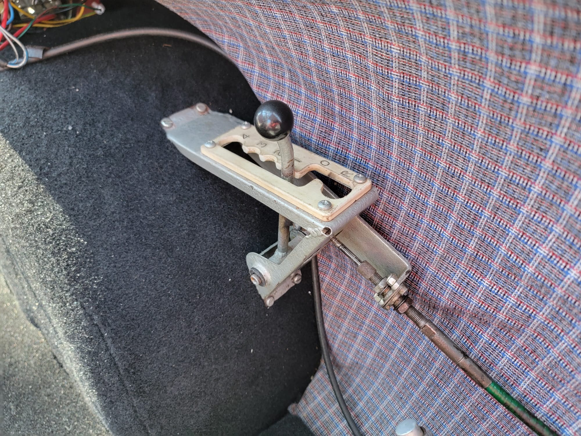 Inside, the right-hand-drive cabin features a two-wide bench trimmed in blue tartan with grey vinyl accents. Black carpeting—replaced prior to sale—lines the floor, and the interior includes a roller-style accelerator pedal and a rear parcel shelf.
