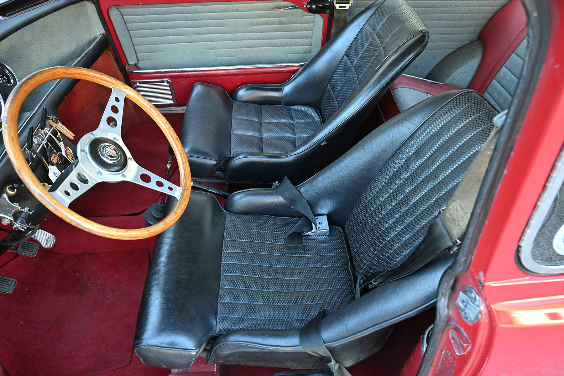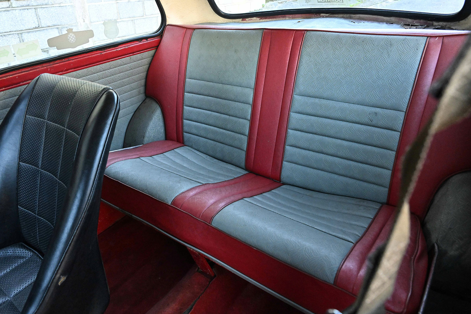 Finished in a vivid red with a contrasting black roof, the Cooper S has a wonderfully evocative cabin trimmed in red and grey vinyl, with period gold brocade inserts on the door cards, rear bench, and dashboard, complemented by red carpets and black vinyl-trimmed bucket seats.