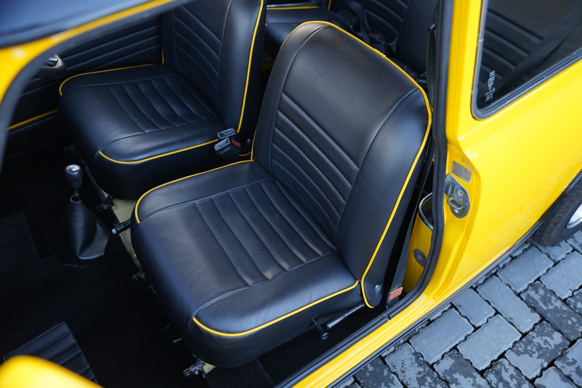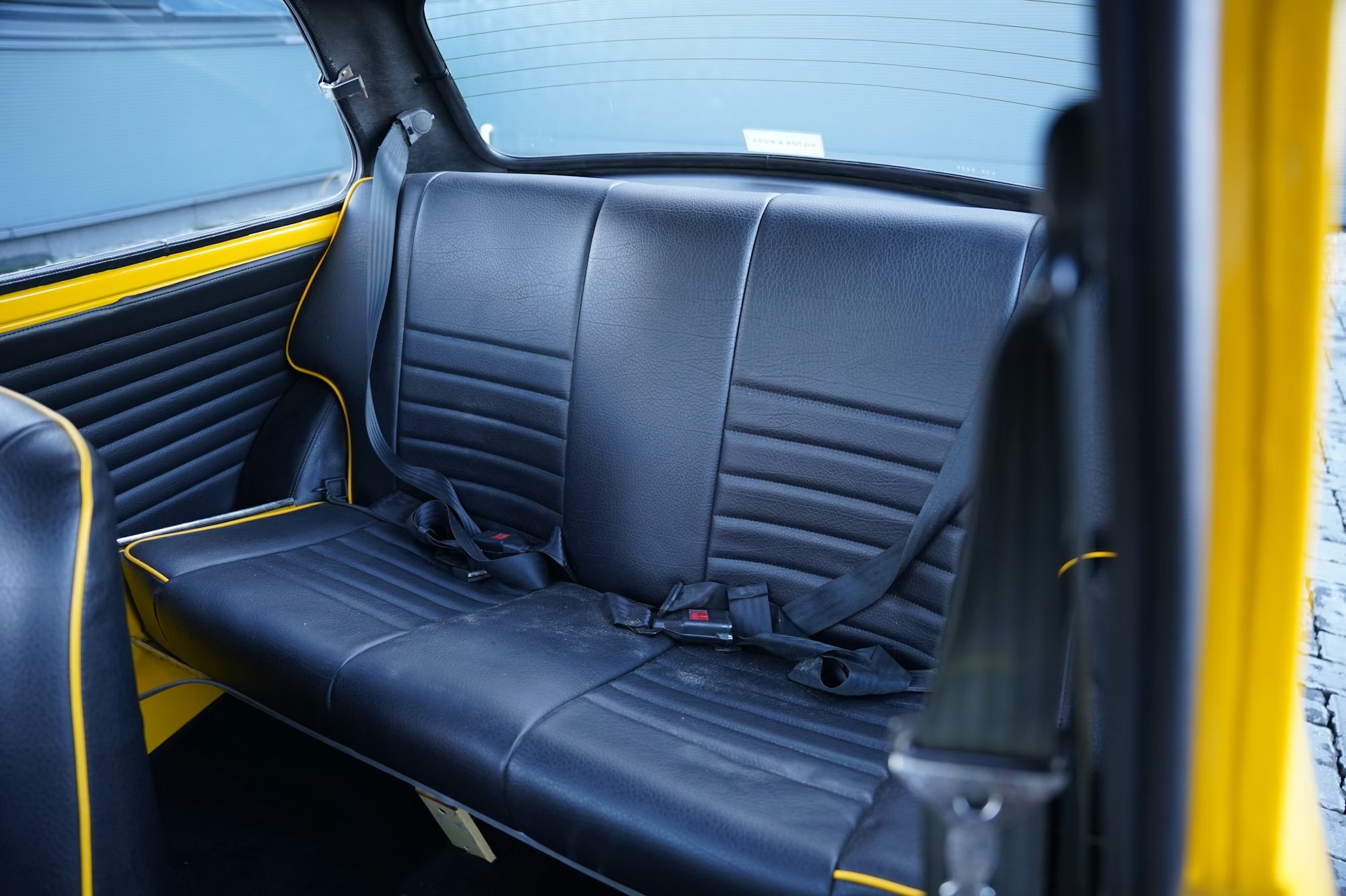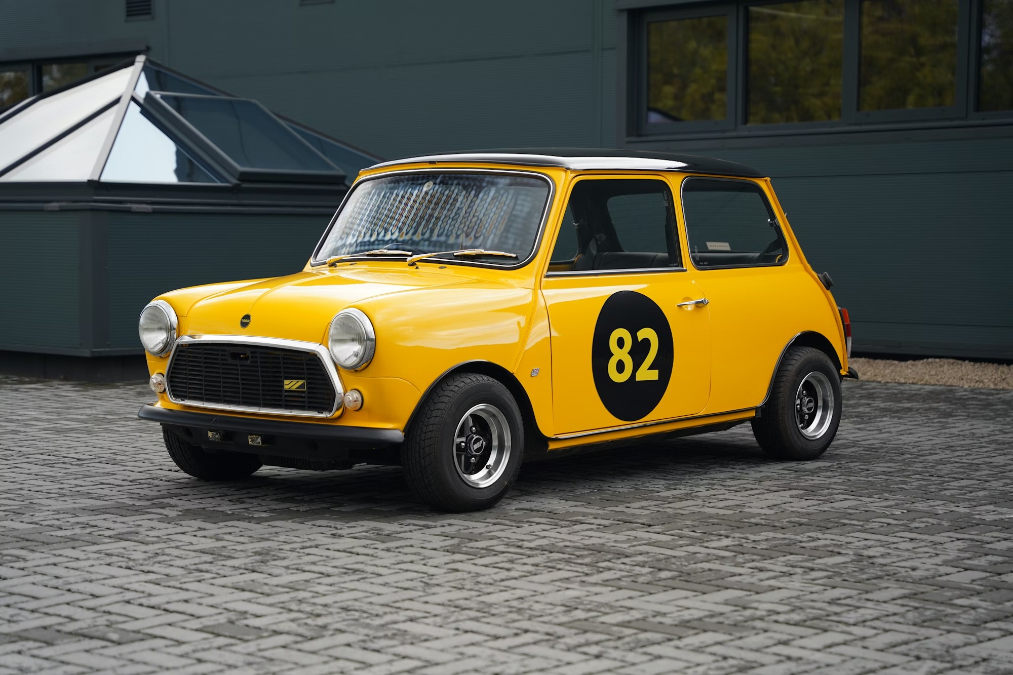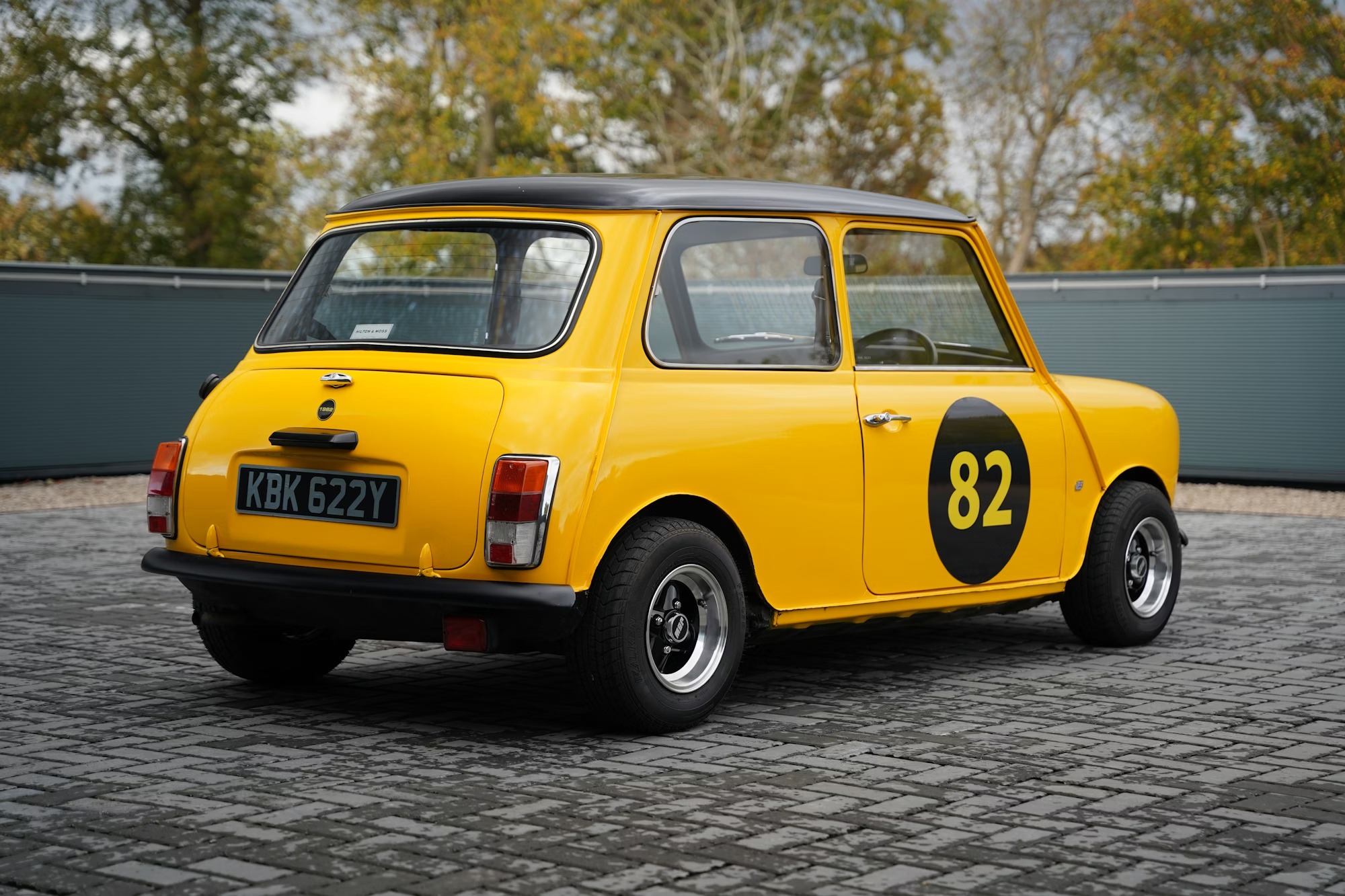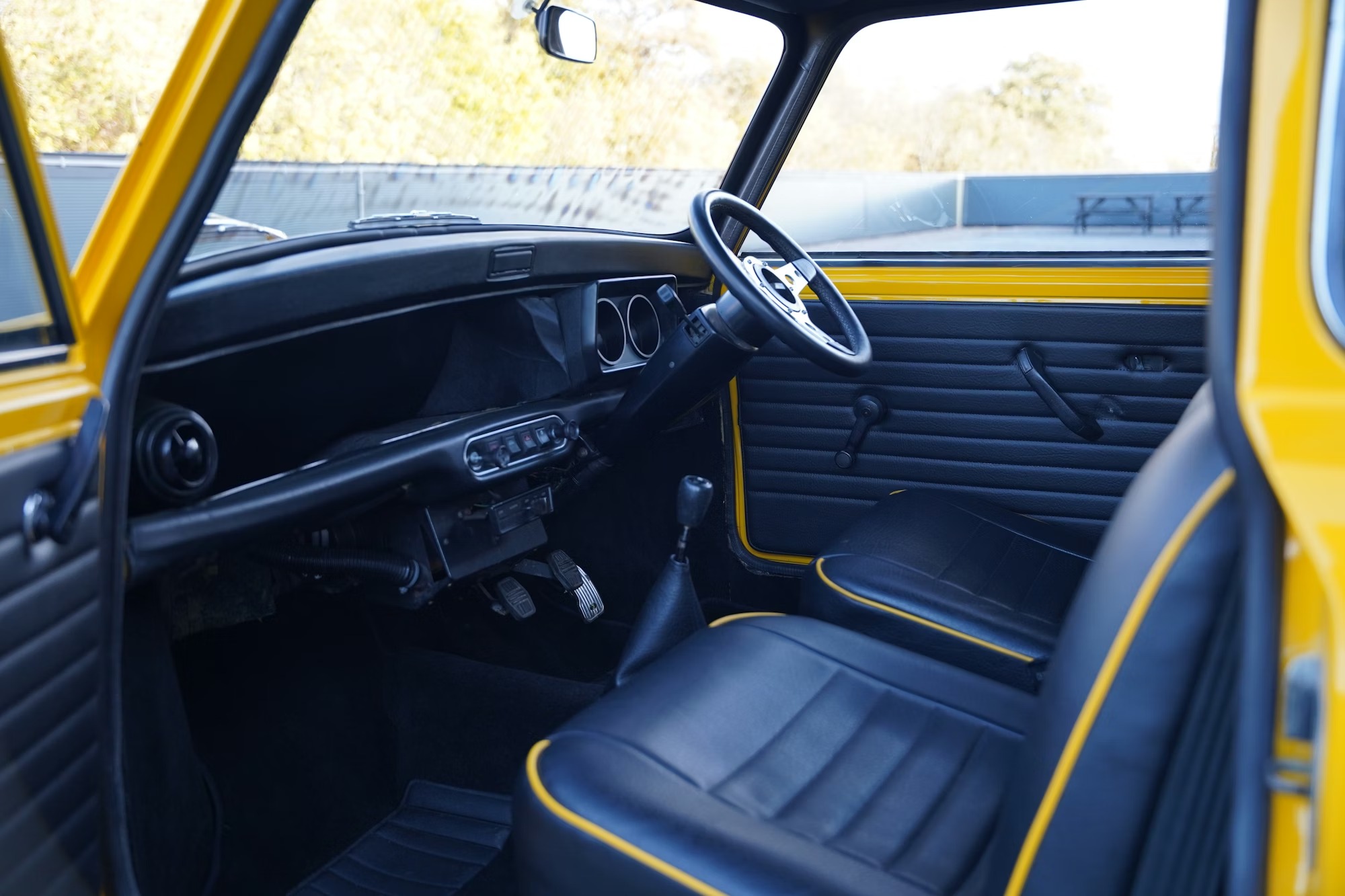 The car is finished in Primula Yellow with a contrasting black roof and ‘82’ roundels, while the interior is trimmed in black upholstery with yellow piping.