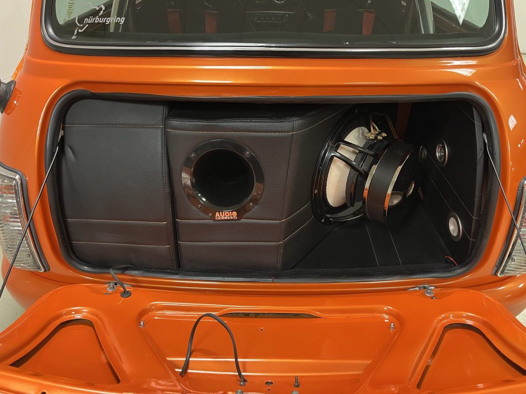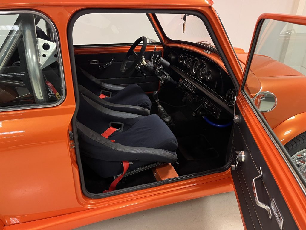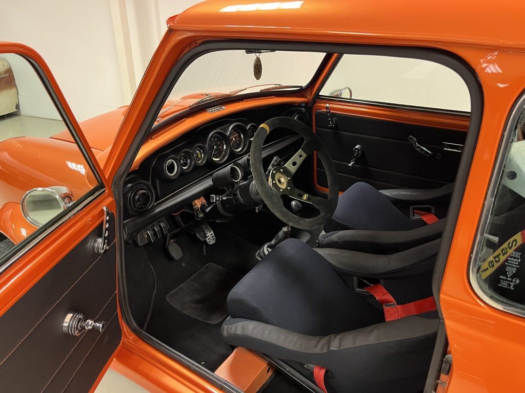 Refinished in metallic orange, the car is equipped with a four-speed manual transaxle, 13-inch Minilite-style wheels, front disc brakes, and a Maniflow exhaust. Inside, it features Sparco seats, Sabelt harnesses, a quick-release OMP steering wheel, an Innocenti gauge cluster, a rear roll bar, and an Alpine Bluetooth audio system with a speaker enclosure and trunk-mounted subwoofer.