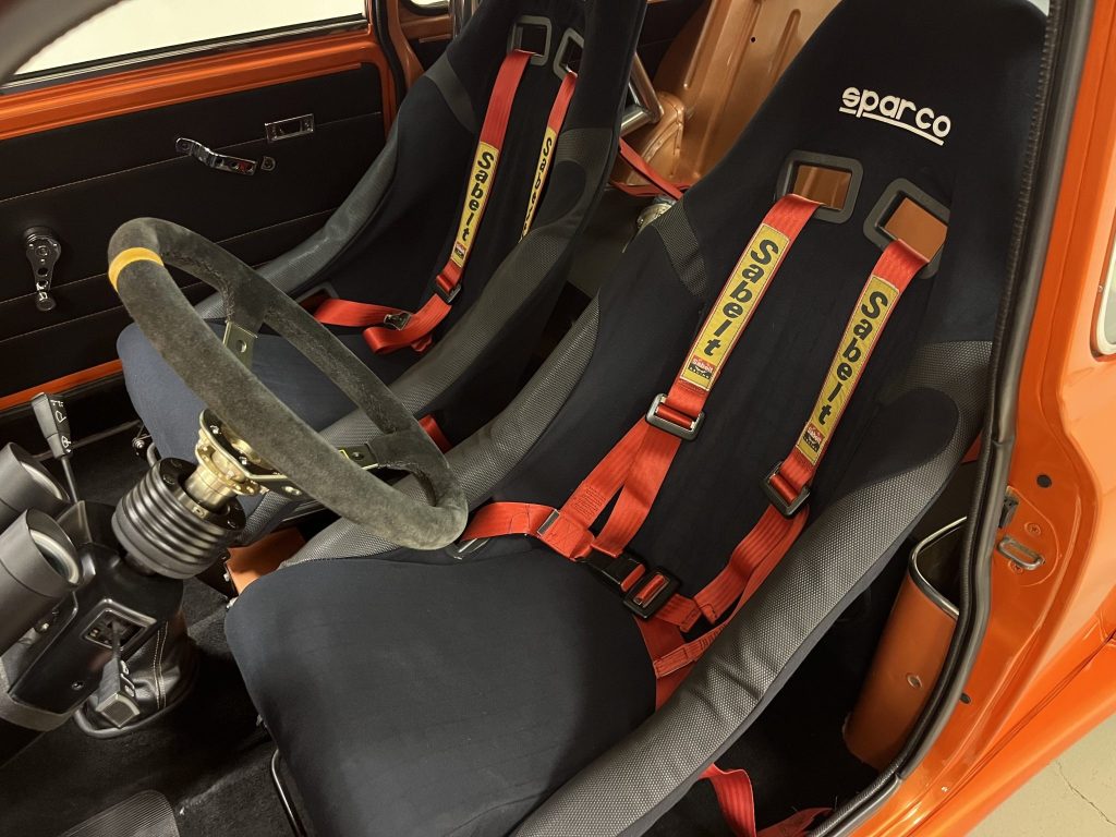 The cabin is outfitted with Sparco bucket seats, Sabelt four-point harnesses, black carpeting, a heater, and a polished rear roll bar.