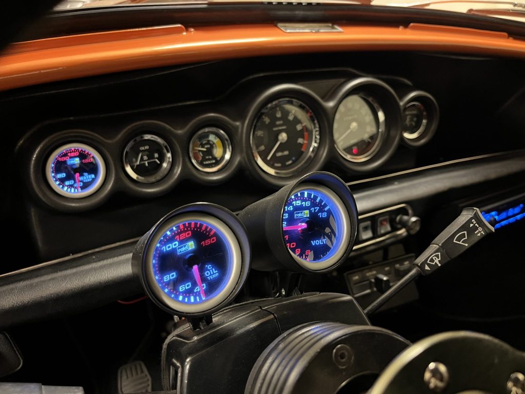 The OMP steering wheel sits on a quick-release hub and a lowered column. The Innocenti cluster and auxiliary pods use Veglia Borletti, Smiths, and Raid HP instruments, including a 200-km/h speedometer, a 7,500-rpm tachometer, and gauges for fuel level, oil pressure, vacuum, water temperature, oil temperature, and voltage.