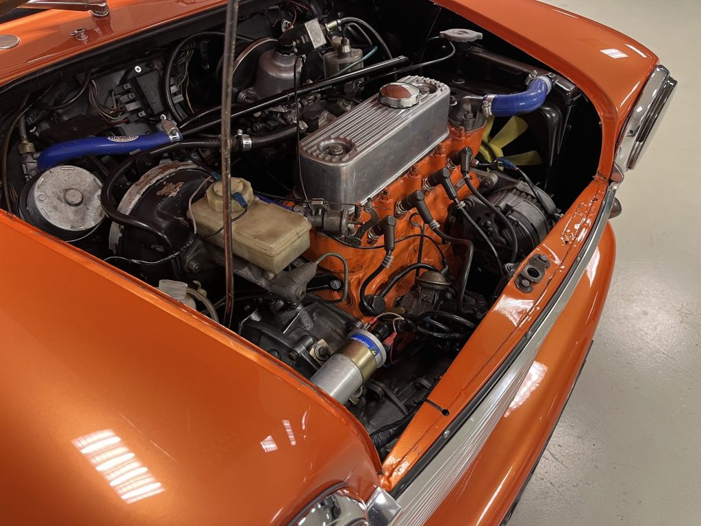 The replacement 12H-series 1,275-cc inline-four, installed in 2017, is equipped with a Minispares intake manifold, SU carburetor, open-element air filter, finned aluminum valve cover, Intermotor ignition coil, and Revotec silicone hoses. The most recent oil change took place in August 2025.