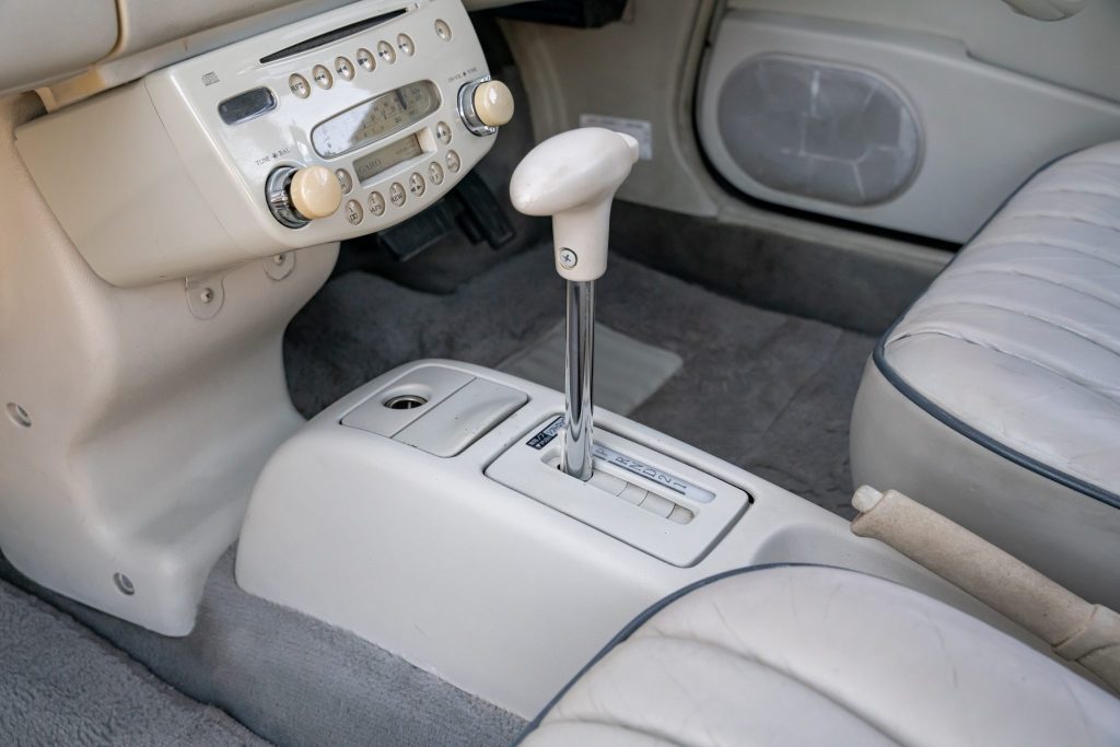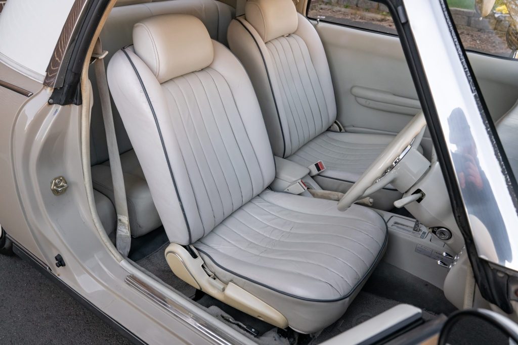 Inside, the right-hand-drive cabin features front bucket seats with adjustable headrests and a two-place rear bench, all trimmed in Creme leather with grey piping. Amenities include air conditioning, power windows, and a CD/cassette stereo.