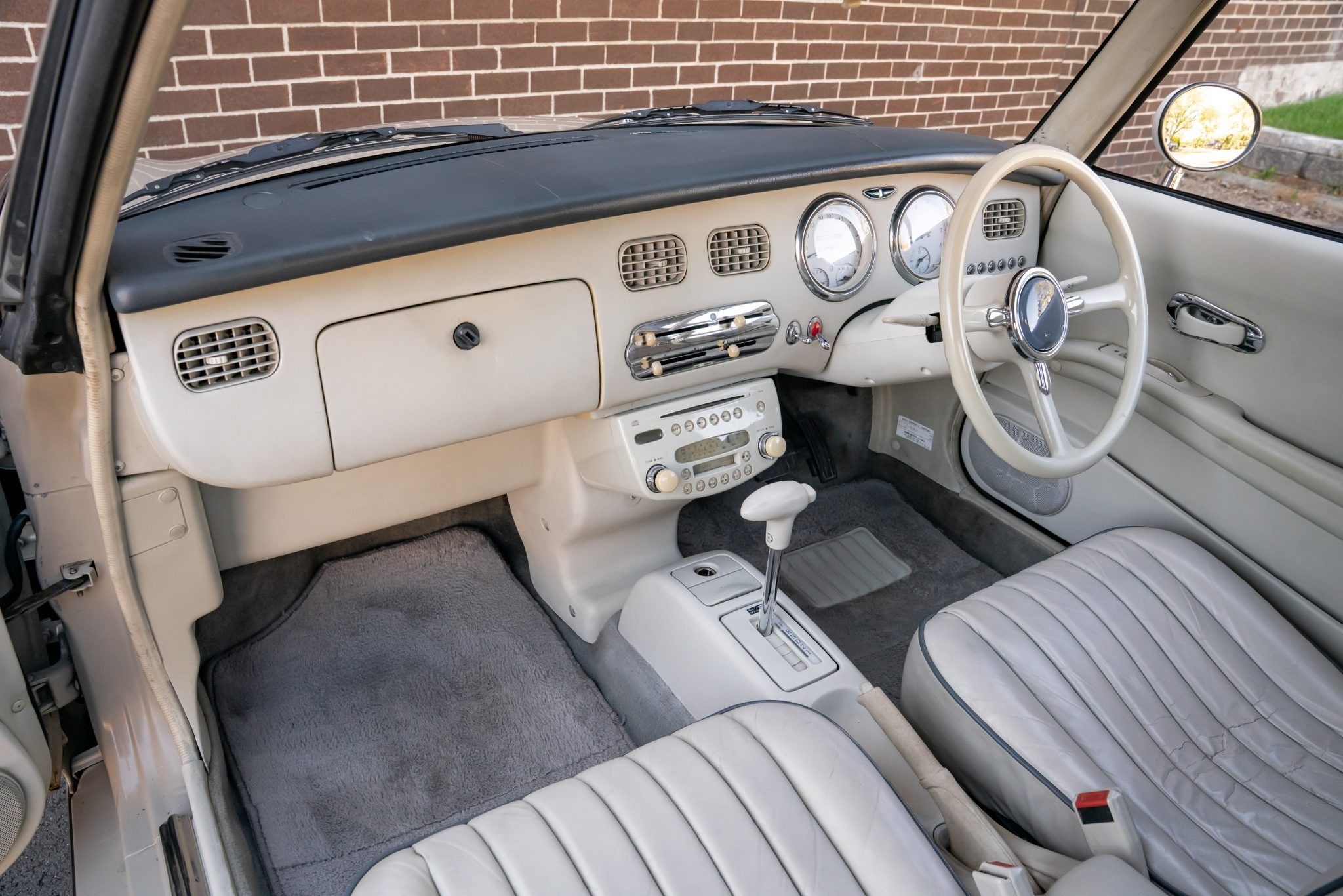 This 1991 Nissan Figaro is a Japanese-market fixed-profile convertible imported to the US under previous ownership and acquired by the selling dealer in 2025. Finished in Topaz Mist with a Creme leather interior, it is powered by a turbocharged 987cc inline-four paired with a three-speed automatic transaxle.