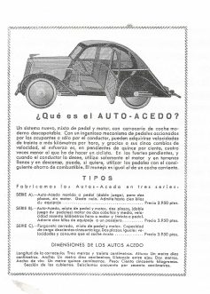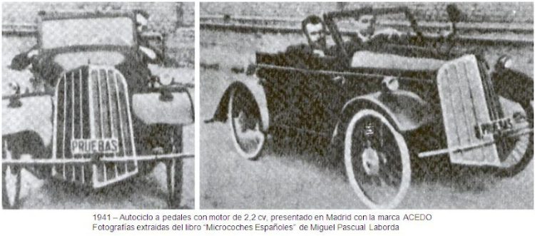 The Auto-ACEDO car was developed by the company “Maquinaria Agrícola y Ferrocarril de Alava” and was part of a series of prototypes developed by them during the 1940s. It was a small vehicle that could be driven with pedals or a 2.2 horsepower four-stroke engine, which makes it one of the earliest hybrid vehicles in history.