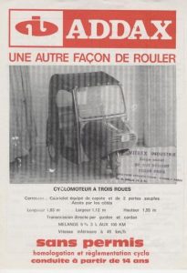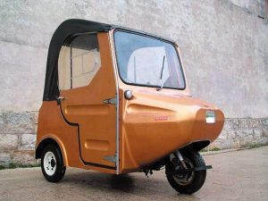 Addax was a French car manufacturer, located not far from Paris. Addax Type 47 was its first and the most popular 3-wheeler fitted with a polyester body. It was equipped with a Fichtel and Sachs 2-cylinder 47 cc engines rated at 2.6 hp at 6700 rev/min. It has a top speed of 45 kph. Overall dimensions – 1830x1120x1550 mm. Fuel consumption – about 3 liters per 100 km.