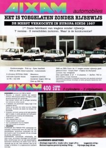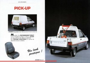 Aixam range of the early 90s included several commercial versions called AIXAM 400UT and AIXAM 500UT. They were equipped with the same 2-cylinder Kubota engines as the regular versions with volume of 400 and 479 cc, respectively. These cute cars could carry 360-380 kg. Curb weight – 400-440 kg (depending of the version). Gross weight – up to 800 kg. Overall dimensions – 3230x1435x1580 mm. AIXAM offered several versions in the commercial range: chassis with a cabine, furgone and pick-up.