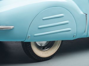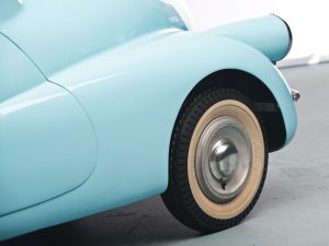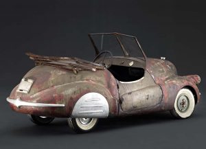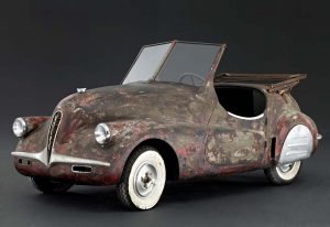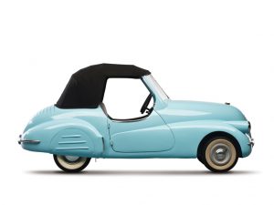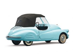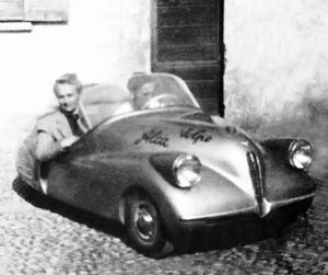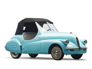 The design of this rare Volpe roadster made by Alca (Anonima Lombarda Cabotaggio Aereo) is very attractive, and its history is is full of lights and shadows. This tiny 135 kg microcar was nly a little over a meter in width and height. Top speed is 75 kph. It was announced in Rome on March 30, 1947. This was one of the first so called ‘bubblecars’ – microcars, which become popular in Europe about a decade later. It was innovative, yet simple, easy to drive, robust. Also it was cheaper than Fiat Topolino – one of the most popular microcars in Italy.