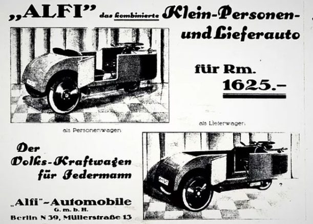 A new company, Alfi Automobile GmbH was established in 1927, also by Alex Fisher. This time the cars and vans were three wheelers powered by 2 cylinder 2 stroke 2-stroke, 500 cm3 DKW engines with a power ranging from 3 hp to 4.5 hp driving the single front wheel which could be rotated 180 degrees to roll the car backwards.