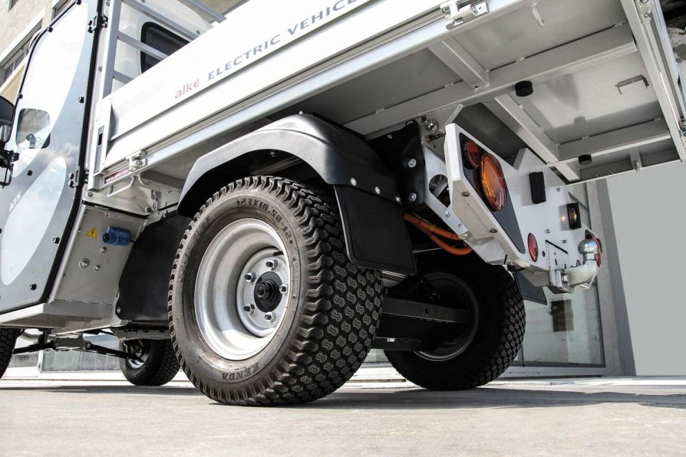 These electric vehicles are equipped with front Mac Pherson suspensions and rear De-Dion axle and stabilizer. The ATX210E differs from the ATX110E in its different dimensions of the loading platform and the different wheelbase. The rear cargo bed of the ATX210E has a length of 180 cm.