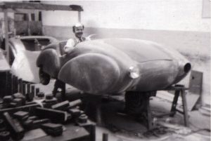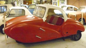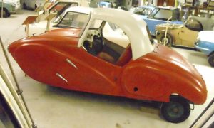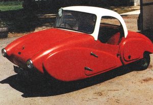 The body was made of fibre glass and was a rather strange shape. A single door was fitted to the left hand side of the car giving access to a wide bench type seat which could just accomodate three people, the driver having to slide along it to reach the right hand side. The lid at the rear of the car was not an opening for the luggage compartment, or an engine cover. It was in fact a ‘dicky seat’ of the type fitted to some vintage vehicles. Opening this cover provided additional seating for two children, with no protection from the elements!