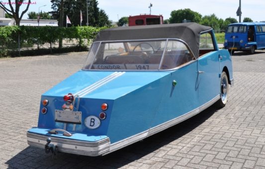 Before the Second World War it produced trailers and tricycle vans under license from Goliath. After the war, in 1946, Altona presented an air-cooled 800 cc three-wheeler with chain drive. The bodywork consisted of steel plate over a wooden frame and a canvas roof. Only one prototype was built, no production models. The Altona Condor was not a small tricycle, it is almost two meters wide and four meters long.