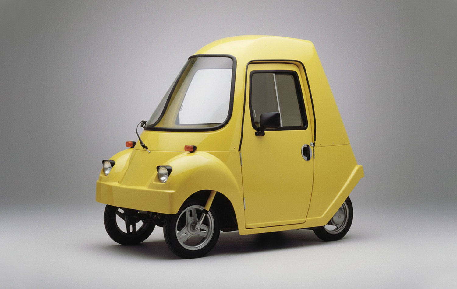 The three-wheeled microcar received a one-volume body that looked like a cute toy. It has one door on the left, a panoramic window in front and one tail light.