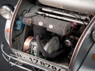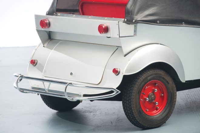 The gearbox had 3 forward speeds (no reverse) with a steering wheel-mounted lever and drove the front wheels via chains. From 1955 the reverse gear was realised by reversing the engine, so the car had 3 reverse gears.