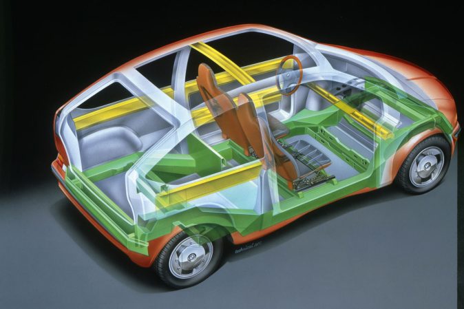 The tiny E1 city car, presented in 1991, used an aluminumand-composite structure, seated four—plus luggage—and claimed a perhaps optimistic 120km/h top speed and 200 km range from its sodium-sulphur battery mounted under the rear seat. The E1, so called to stress its pure electric driveline, was fully roadworthy and is cited by BMW as an important steppingstone in the engineering progression that led to the i3 megacity car in 2013.