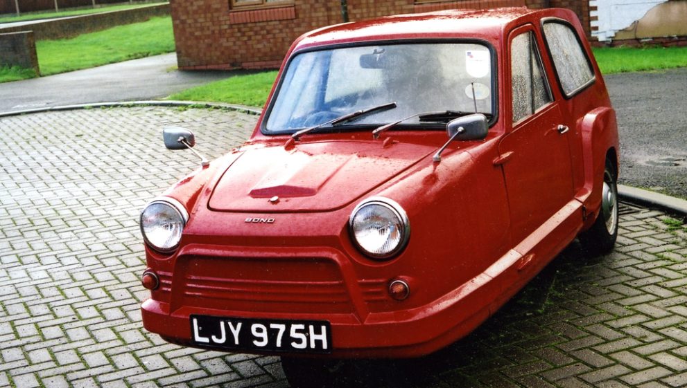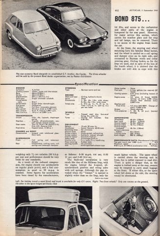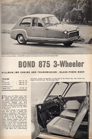 The new 3-wheeler got 875 cc 4-cylinder 4-stroke 34 b.h.p. engine. The same was used in Commer Imp Van. This was rear-mounted, unlike in most other British three-wheelers of the era. The water-cooled engine behind the transaxle drove the rear wheels. It also was fitted with a 4-speed and reverse gearbox, and independen suspension on all wheels. Bond 875 weighed less than 400 kg (82 lb), thanks to fibreglass body with aluminium doors. Tires were 12″ x 5½”. Top speed: 80 mph (129 km/h). The standard Imp instrument binnacle was mounted directly onto the glass fibre dash. The Bond 875 Mark II was introduced in 1968.