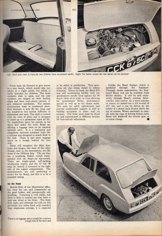 April 1967, the commercial version Bond 875 Ranger was introduced. It based the Saloon version and had a lift up tailgate, no rear side windows and single drivers seat in the front. Its iternal capacity is 40 cu. ft. A single wing mirror was fitted – by law – to the right hand front wing. The spare wheel, heater/demister and the passenger’s seat could be ordered as an option. Price (with no purchase tax payable on commercial vehicles) was £417 10s 0d (£417.50p) in primer or for another £10 the body could be painted!