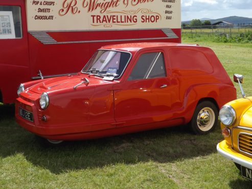 Production versions didn’t have front bumpers. A bonnet and engine cover were made of glass fibre. Non-opening rear side windows in Perspex were used. Steering problems had also been overcome with the introduction of the fully floating front brake back plate. Price £410 plus £86 19s 7d purchase tax making a total of £496 19s 7d. (£496.98p).