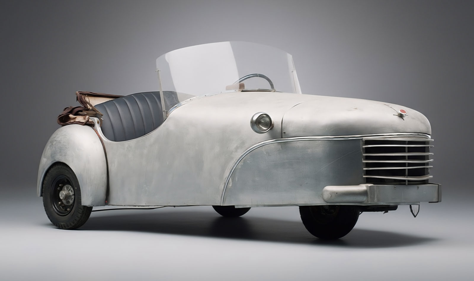 There were no doors, in order to retain the shell’s rigidity, but simply a slight curved cut-out to the cockpit side. The single front wheel was driven by a 122cc Villiers MK10D two stroke engine mounted on the front suspension so that it turned with the steering. Only the rear wheels were braked, there was no rear springing, and the single windscreen wiper was operated by hand.