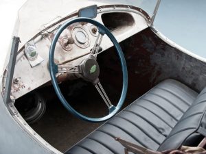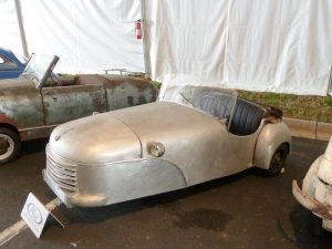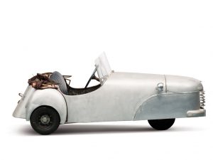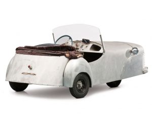 Full scale production started in early 1949 at Sharp’s Ribbleton Lane in Preston. The company produced only 15 Bond Minicars per week in the beginning. The Bond Minicar Mark A as it was later to become known had two seat, open topped bodywork made largely of aluminium. There were no doors, in order to retain the shell’s rigidity, but simply a slight curved cut-out to the cockpit side. The single front wheel was driven by a 122cc Villiers MK10D two stroke engine mounted on the front suspension so that it turned with the steering. Only the rear wheels were braked, there was no rear springing, and the single windscreen wiper was operated by hand.