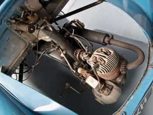 The engine, again a Villiers unit, continued to be mounted as part of the front suspension and steering. The rear suspension was by “six-hole” Flexitor bonded rubber units produced by George Spencer Moulton & Co. Ltd. and the brakes operated on all three wheels (finally!). The horn, wiper motor and lights are still used 6 volts electric. Starting was by means of a floor-mounted handle and cable to a modified kickstart lever. Deluxe version received an electric starter (but the floor-mounted handle was retained – just in case!). In June 1953, the company introduced Villiers 8E 197cc engines and a chain adjuster.