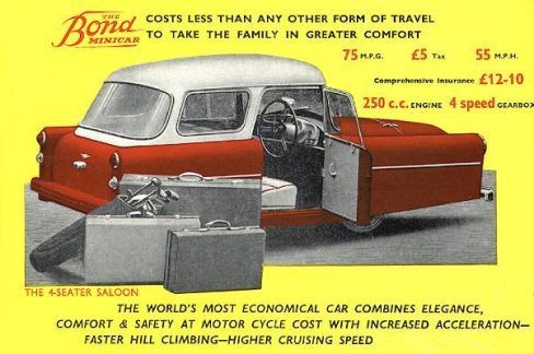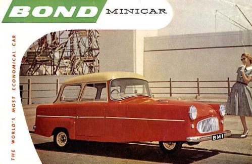 Three versions were available from the beginning: Mark F Tourer, the Mark F Saloon Coupe and the Mark F 4-Seater Family Saloon. Dimensions and weight (672 lb) remained unchanged. Available colors are also the same: Scarlet, British Racing Green and Light Green. Bond Minicar Mark F was extremely successful. The company produced almost 100 cars per week.
