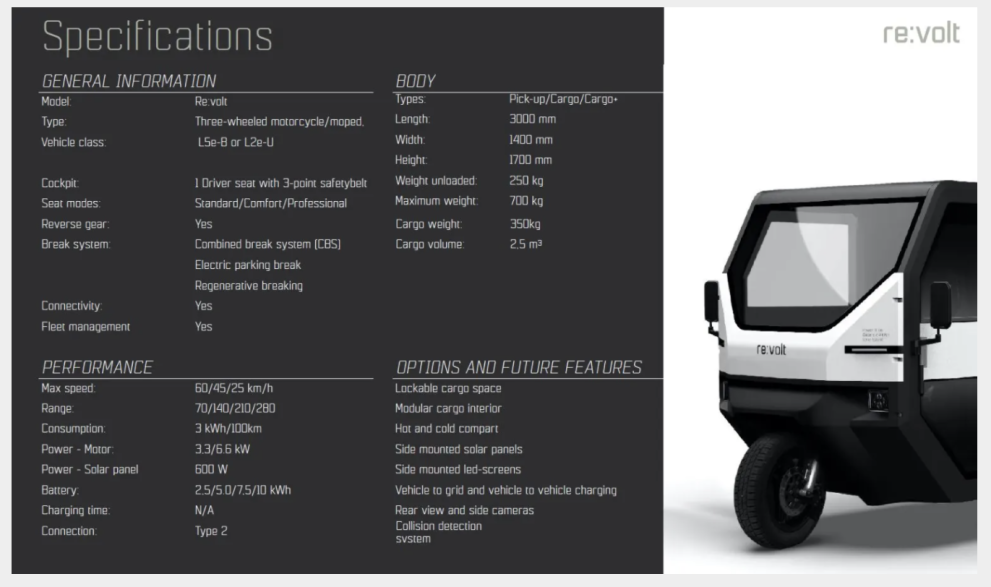 Re: volt is a small, rugged and modular delivery van designed to meet the huge demand for eco-friendly last-mile transport in cities. It has a roof with solar panels, which makes it energy efficient. The electric car is built on a flexible platform that adapts to the scope of use. The range of the model is 100 kilometers, but it can be adjusted from 70 to 280 kilometers. And in ideal conditions the range in general can reach 380 km.