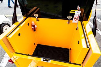 The first generation COMS was originally capable of only 50 to 60 km/h, so that’s about the speed at which I can drive it. The battery is charged at a 100 V household outlet, and the driving range depends on the temperature (which affects the battery).