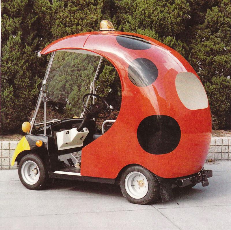 It looks like an electric golf cart with a body styled to resemble a ladybug.