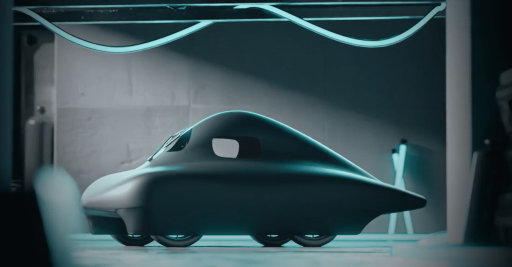 The design of the Eco-Runner XIII is futuristic, resembling a blazing comet or a compact UFO gliding through the streets. The driver sits upright with a clear view through small windows along the line of sight. The shape of the car slopes down to reveal the four wheels, with hidden hinged panels that can cover and reveal the wheels, reducing material fatigue. From above, the design looks like half of a surfboard or boat, with a pointed tail and almost pointy tip that draws from the previous model, the Eco-Runner XII.