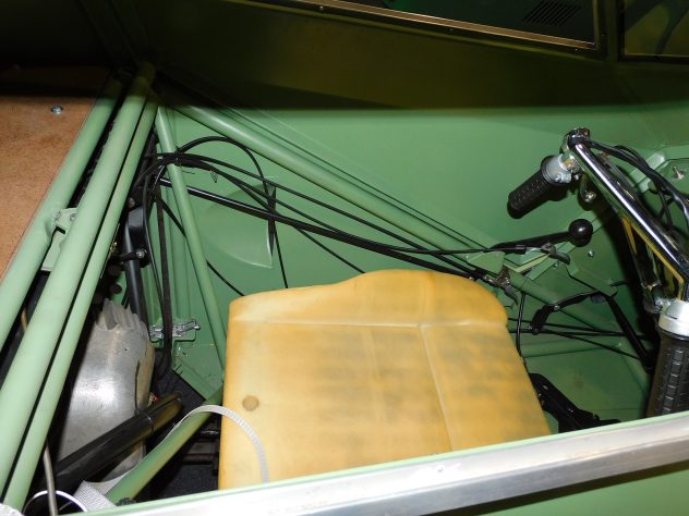 Constructed of a steel frame and aluminum panels, the Flitzer was fully enclosed with front, side and rear panels. At the top was a hatch that was hinged to the front end and tilted forward to allow the driver easy access. The first version of the Flitzer was uncovered, with only a hole and windshield in the hatch to protect the operator’s head and shoulders from the wind. Later models were fully enclosed, including the operator, windshield, and side windows.
