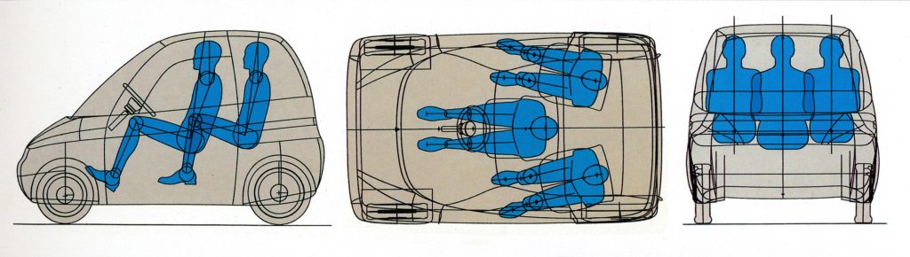 The side passengers’ backrests were angled outward to clear the rear wheel arches, while their legs extended forward alongside the driver’s seat, making efficient use of the tiny footprint.