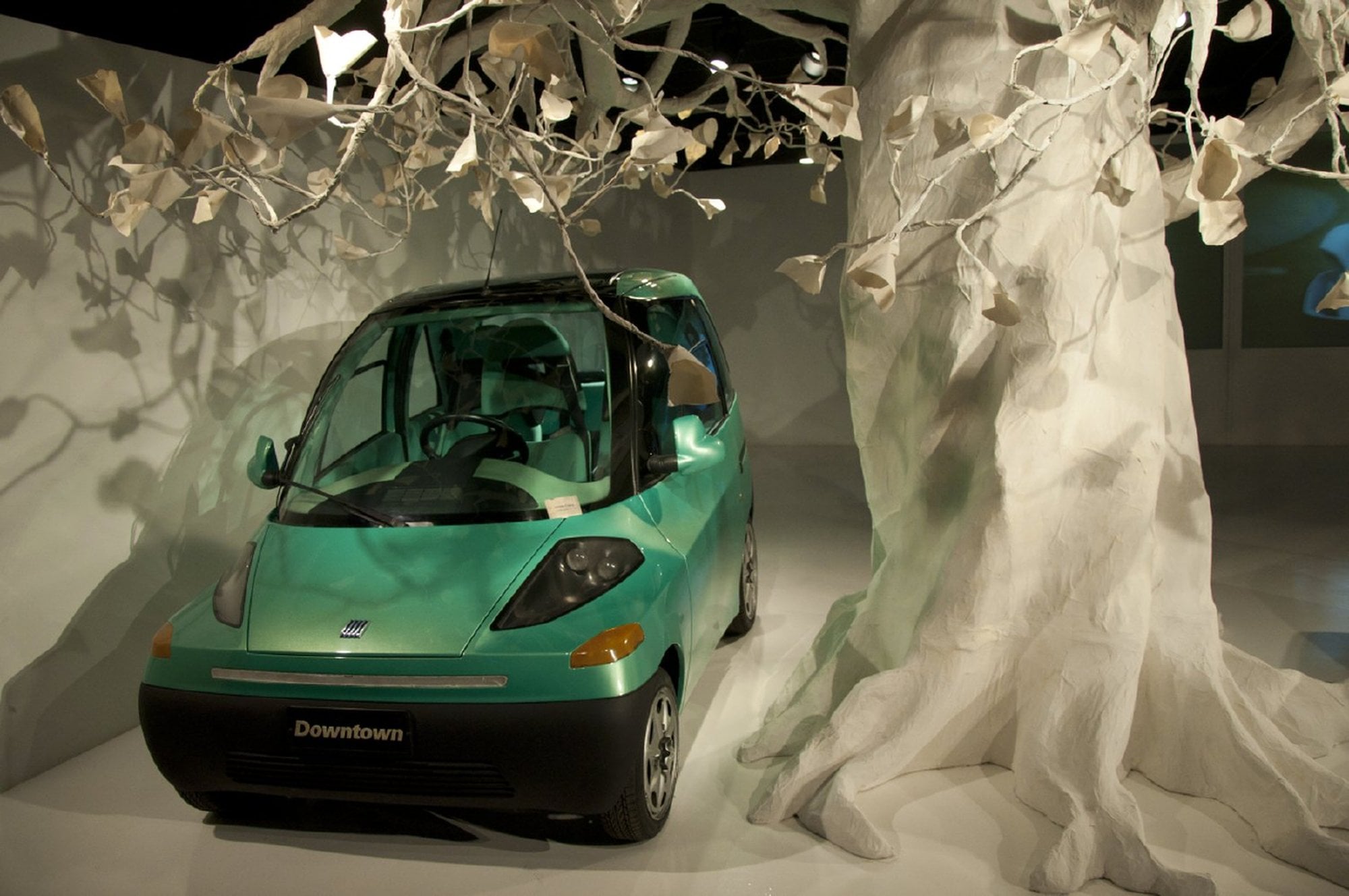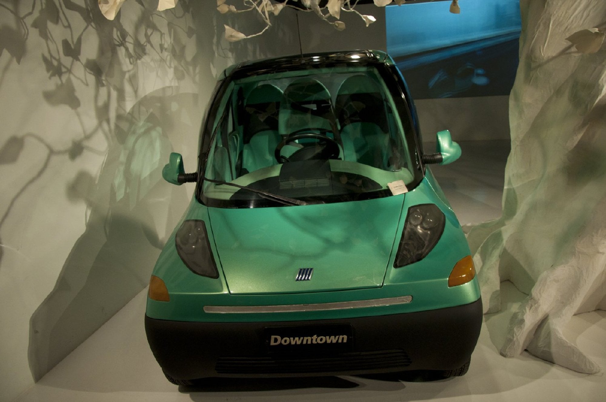 The Downtown combined an aluminium chassis with a plastic/composite body, keeping kerb weight down to about 700 kg despite the battery pack. The body panels were designed to be fully recyclable, aligning with the project’s ecological theme and reducing projected production and running costs.