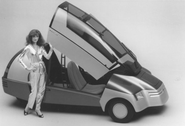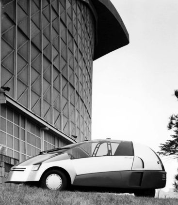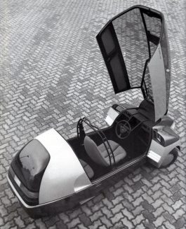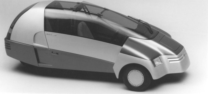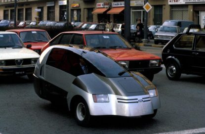 The concept car was equipped with a single-cylinder 200 cc engine rated at 12 hp and mounted inside the rear wheel. It was projected to achieve fuel economy better than 75 miles per gallon in city driving. The car body was created by the Italian studio Ghia.