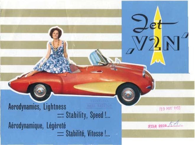 “With its elegantly attractive shape and aerodynamic lines, the Jet V2N is the most original and economical sports car in the world. Thanks to its ultra-light weight (220 kg empty), slightly higher than that of a large motorcycle, the “Jet” climbs any hill and reaches the maximum speed of 60 km per hour with the 125 cc engine, 80 km per hour with the 175 cc enging and 92 km per hour with the 200 cc engine. Straight-line-arranged shifting is child’s play.”