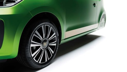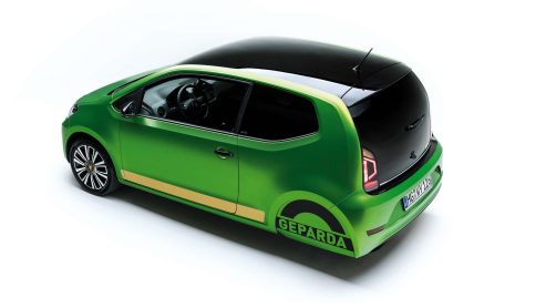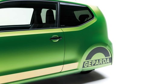 The wheel covers with the huge “Geparda” logo remind the VW XL1, where the extra panels had an aerodynamic function.